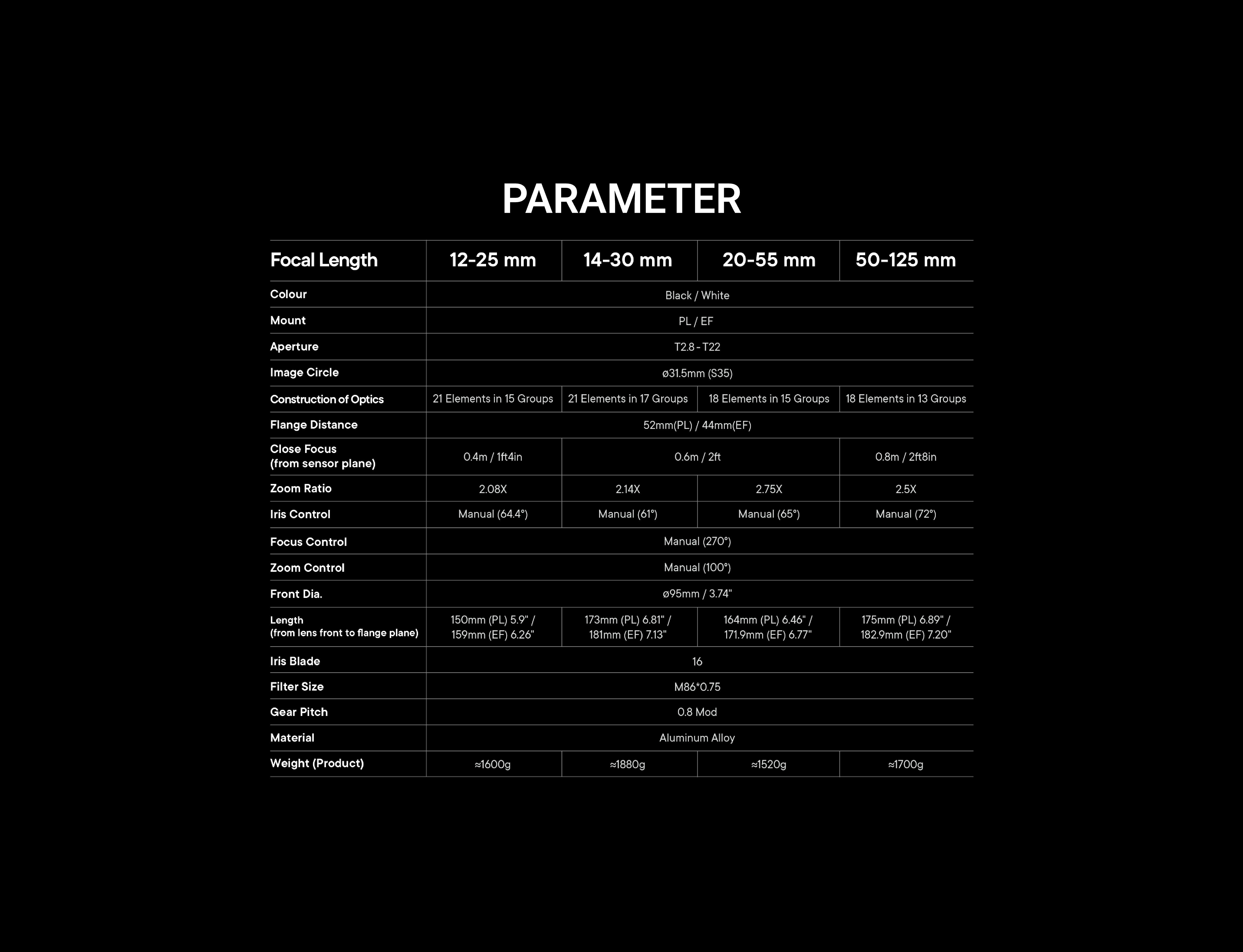 12-25 | 14-30 | 20-55 | 50-125 mm | T2.8 | Super 35